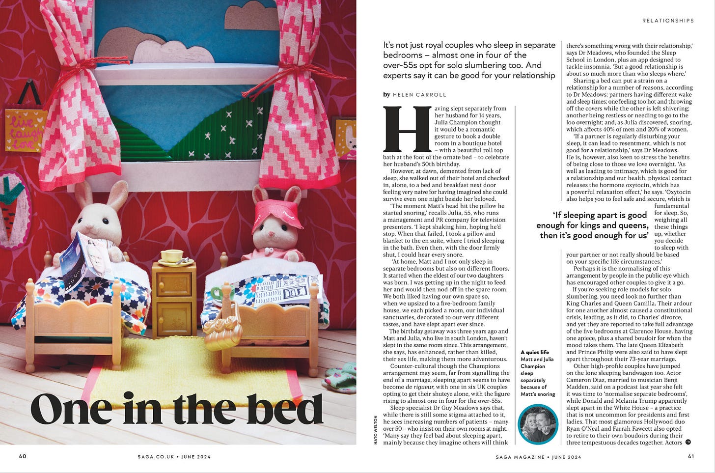 For the past few years, I have art directed a monthly magazine for the over 50s. With the audience, along comes subject matter of features that is at times, erm, challenging to make glamorous. There was that fascinating article (and it really was interesting) on how to improve bladder weakness. I ended up using a stock image of water running from a tap, with the headline ‘Leaking secrets’. Or the piece we published on the rise of older people sleeping in separate beds. I illustrated this with my daughter’s Sylvanian Families rabbits (see below). If you apply the rules of ‘must be Ronseal’ to either of these features, the images you’d end up using would be boring at best, and in the case of the bladder story, really icky. We also lose the playfulness, the creativity that taps into culture and makes the content appeal to real-life humans.